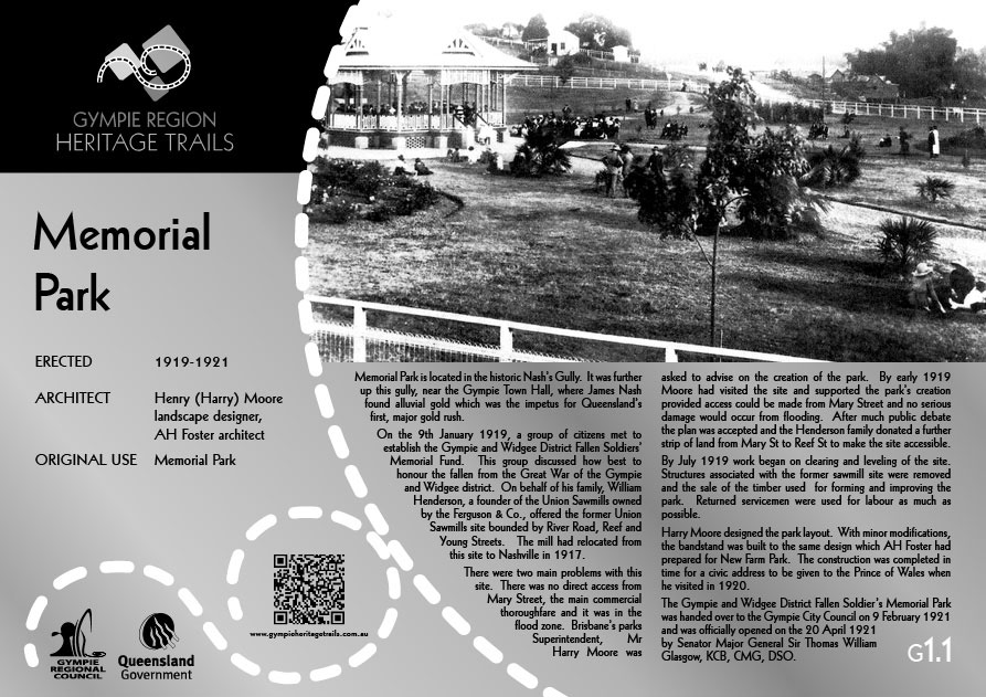 In 1919 the Queensland Institute of Architects held a design competition for a memorial on behalf of the Gympie and Widgee District Soldiers' Memorial Fund. George Rae, then a young draftsman in the Brisbane office of Lange Powell won the competition. He also won the competition for the design of the memorial at Toowong, Brisbane.
