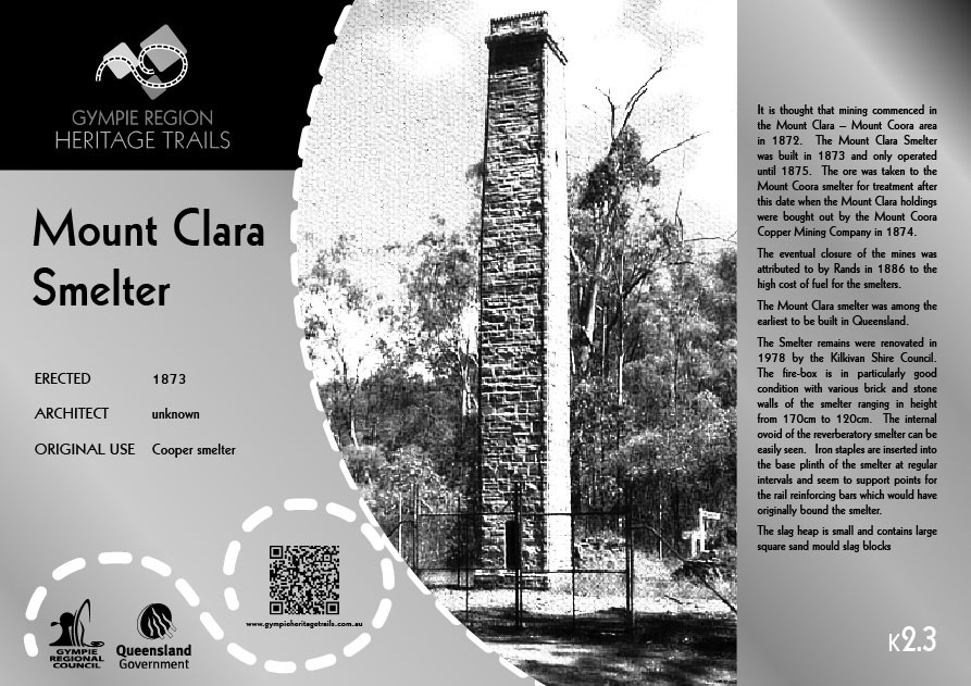The Mount Clara smelter was among the earliest built in Queensland, being built after Peak Downs, Mount Perry and Flanagans smelters, but a year before those at Mount Coora, Blackall Mine and the Adolphus William.