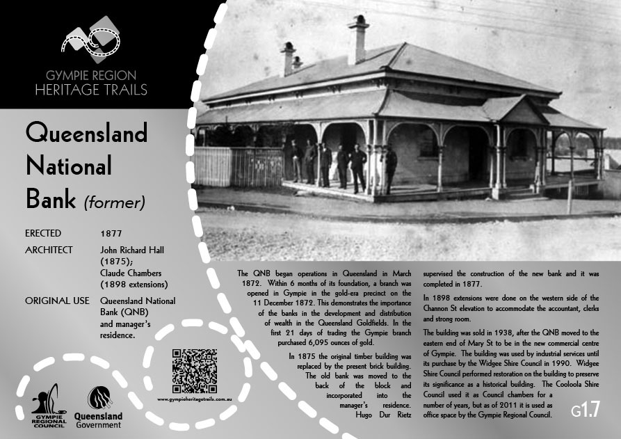 The former QNB building is set apart from other bank buildings also in the Queensland Heritage Register [e.g. QHR 602774, Royal Bank of Queensland (former)] in being one of the permanent commercial buildings that resulted from the success of shallow reef mining, an early phase of gold mining in the town of Gympie, and the expectation of further gold discovery through deep reef mining. For 60 years the building served as a Queensland National Bank branch and manager's residence. It is one of only a few known 1870s commercial buildings remaining in Gympie.